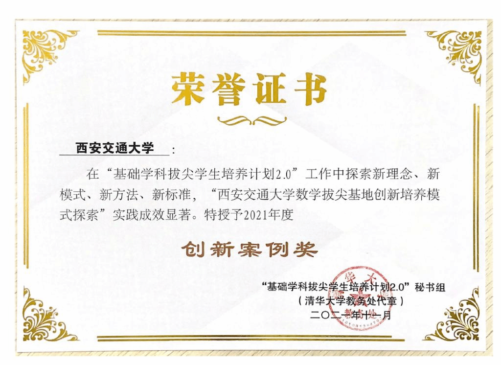 近日,教育部公布了2021年度基础学科拔尖学生培养计划2.0荣誉奖项名单以我院数学拔尖人才培养的特色做法为内容的案例西安交通大学数学拔尖基地创新培养模式探索荣获创新案例奖;我院易媛教授荣获优秀教师奖;我院2015级数学试验班谢鹏程同学荣获优秀学生奖
