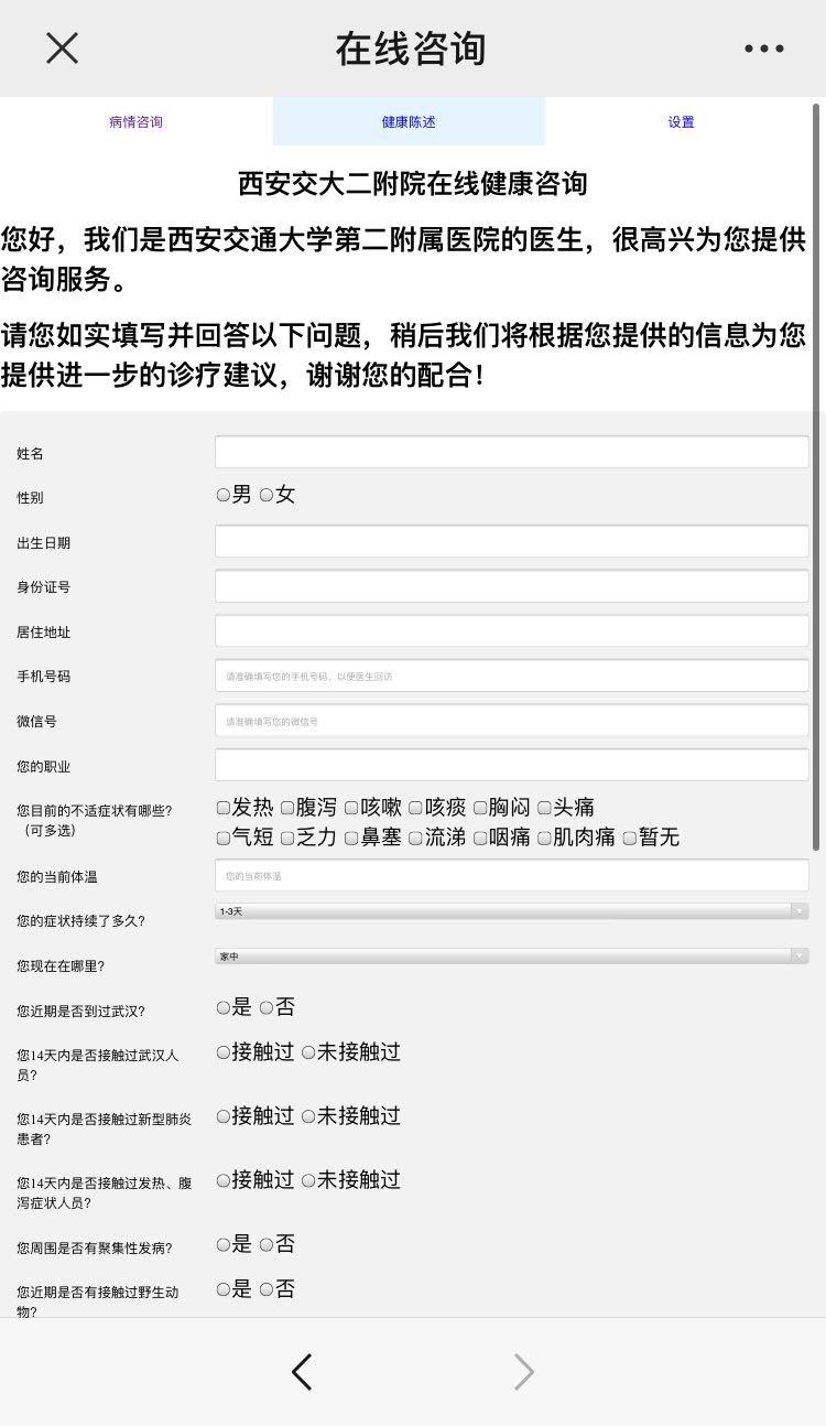 该团队联合大数据算法与分析技术国家工程实验室、西安交大第二附属医院医学人工智能研究院技术力量,春节期间放弃休息进行高强度攻关,开发出了这套系统。通过这套系统,患者可直连西安交大二附院相关科室资深医生,进行远程健康咨询、问诊与新冠风险筛查。